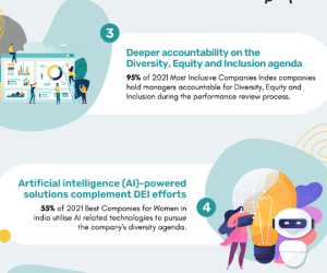 For deeper accountability of the Diversity, Equity, and Inclusion agenda, 95% of 2021 Most Inclusive Companies Index companies hold managers accountable for Diversity, Equity, and Inclusion during the performance review process. Enabling them in the journey is Artificial intelligence (AI)-powered solutions. These complement DEI efforts as at least 55% of 2021 Best Companies for Women in India utilize AI-related technologies to pursue the company’s diversity agenda.