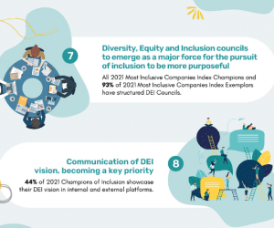 - Communication of DEI vision, becoming a key priority – 44% of 2021 Champions of Inclusion showcase their DEI vision in internal and external platforms.